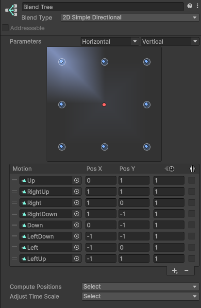 플레이어 내부 이동 로직 클래스에 저장되어 있는 방향을 Animator에 Horizontal/Vertical 파라미터로 넘겨줘 블렌드 트리가 가공하게 했습니다.