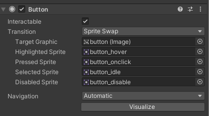 Interactive가 막힌 버튼은 사전 설정된 Button 컴포턴트에 따라 'Disabled Sprite'로 전환되어 해당 버튼이 클릭이 불가능함을 시각적으로 알 수 있습니다.