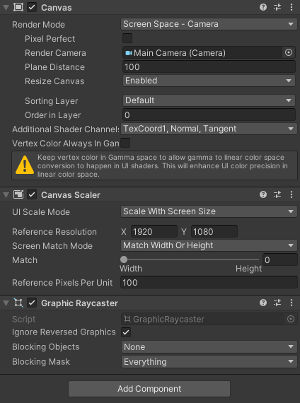 우선 캔버스 설정은 Screen Space - Camera, Scalew with Screen Size(1920:1080)으로 설정되어 있습니다.