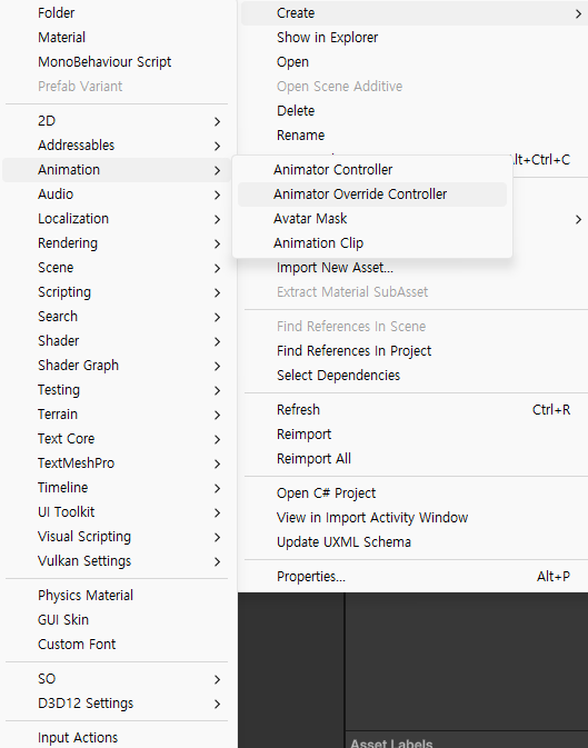 이후 해당 애니메이터의 뼈대를 물려받을 Animator Override Controller를 생성합니다.